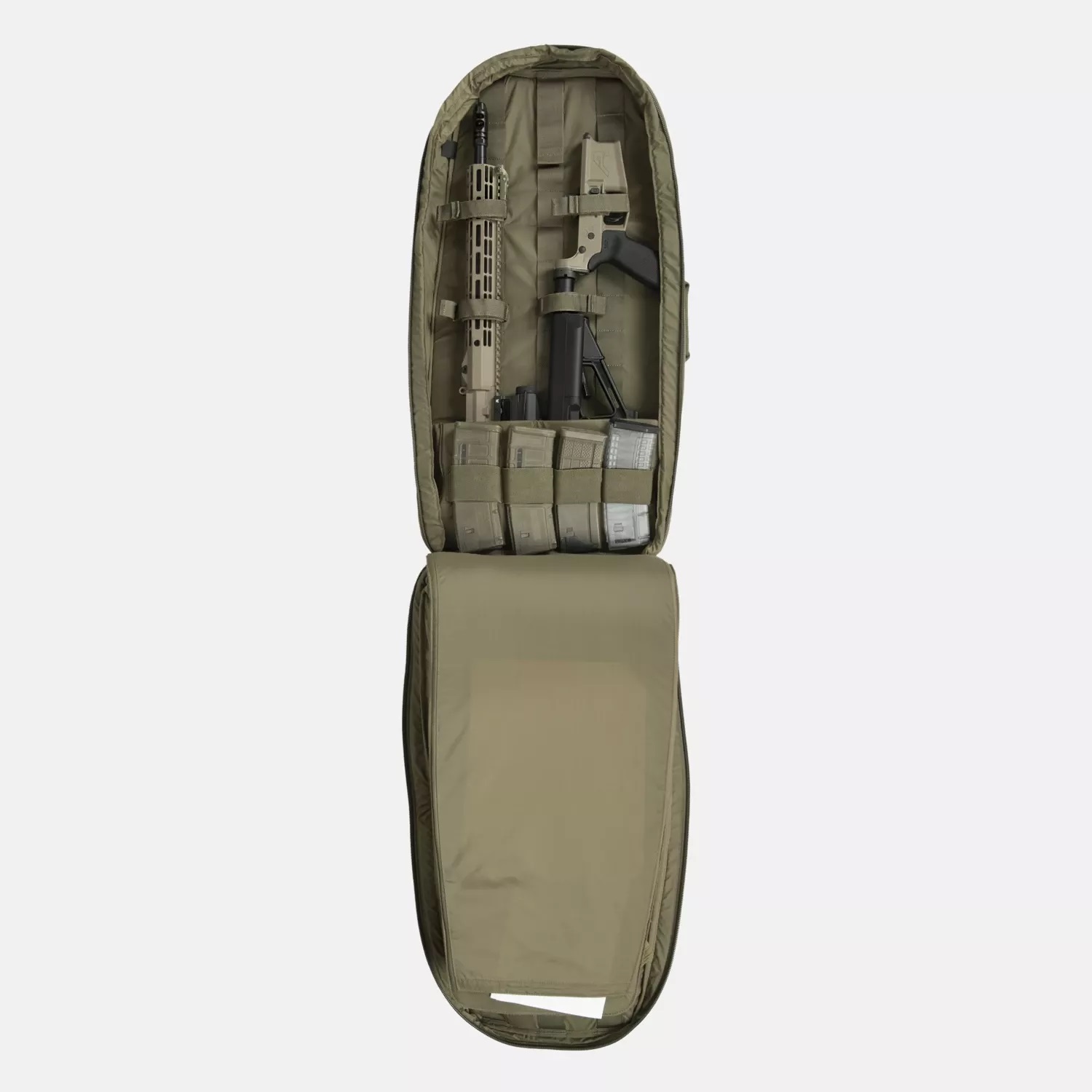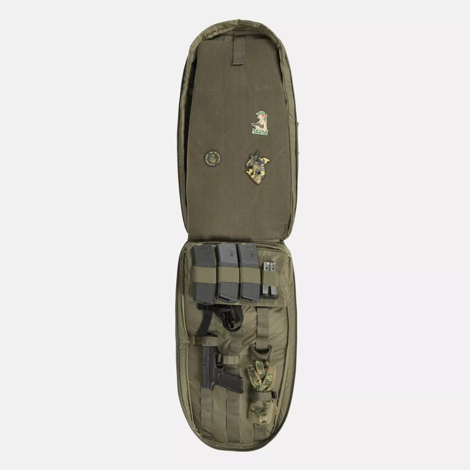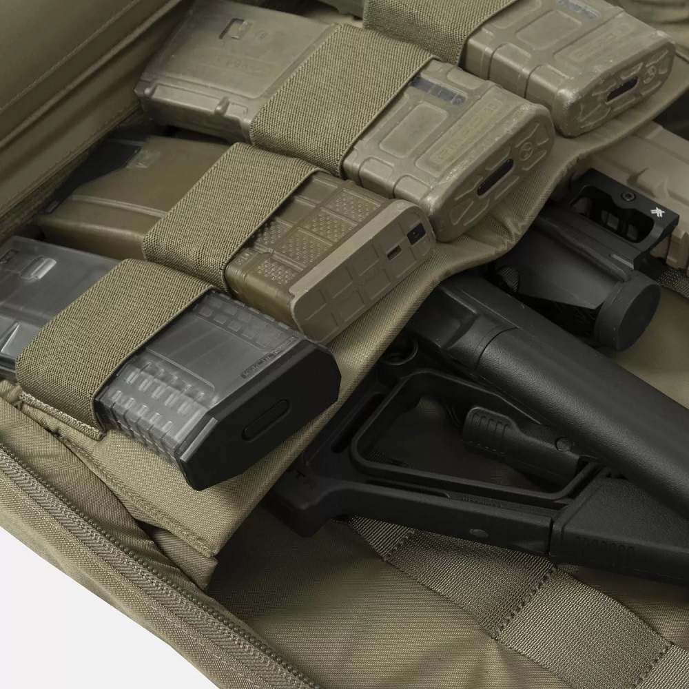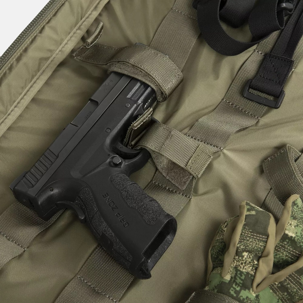Taška je navržena pro přepravu široké škály zbraní, včetně pistolí, samopalů a krátkých pušek (SBR) typu AK47 nebo AR s hlavněmi do přibližně 26,7 cm. Snadno pojme i rozložené pušky s hlavněmi do přibližně 40,6 cm a modely se sklopnou pažbou ve stylu AK.